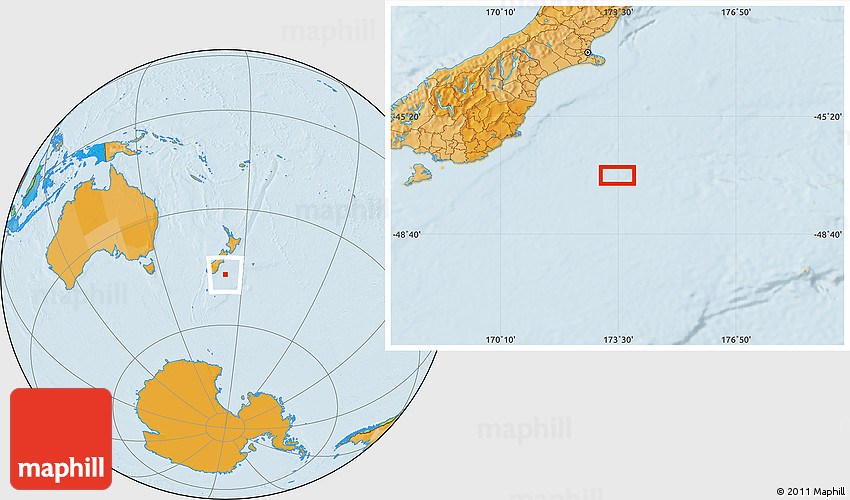 Maphill is a collection of map images. This image combines a political map with the globe centered on the area around 46° 59' 36" S, 173° 28' 29" E. Use the buttons under the image to switch to different map types.