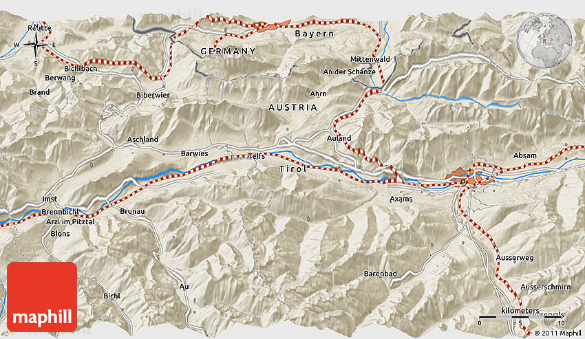 The value of Maphill lies in the possibility to look at the same area from several perspectives. Maphill presents the map of the area around 47° 16' 15" N, 11° 7' 30" E in a wide variety of map types and styles.
