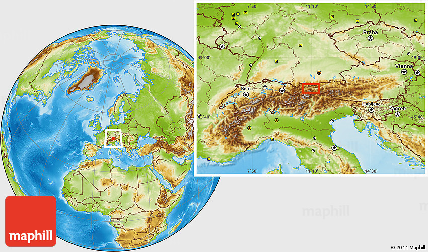 Maphill is a collection of map images. This image combines a physical map with the globe centered on the area around 47° 16' 15" N, 11° 7' 30" E. Use the buttons under the image to switch to different map types.