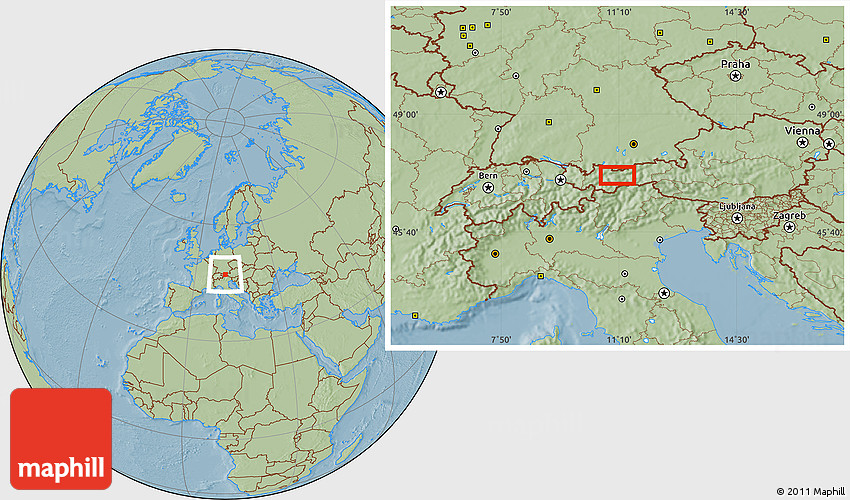 Maphill is a collection of map images. This image combines a savanna style map with the globe centered on the area around 47° 16' 15" N, 11° 7' 30" E. Use the buttons under the image to switch to different map types.