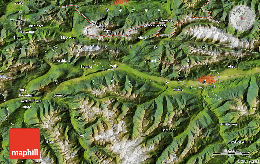 The value of Maphill lies in the possibility to look at the same area from several perspectives. Maphill presents the map of the area around 47° 16' 15" N, 11° 7' 30" E in a wide variety of map types and styles.