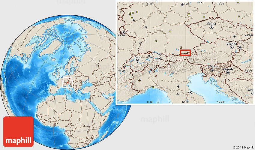 Maphill is a collection of map images. This image combines a shaded relief map with the globe centered on the area around 47° 41' 6" N, 11° 58' 29" E. Use the buttons under the image to switch to different map types.