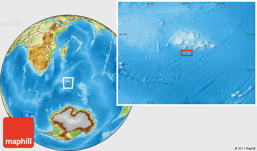 Maphill is a collection of map images. This image combines a physical map with the globe centered on the area around 47° 24' 32" S, 50° 13' 30" E. Use the buttons under the image to switch to different map types.