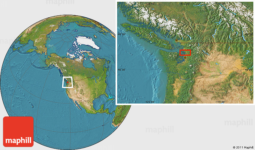 Maphill is a collection of map images. This image combines a satellite map with the globe centered on the area around 48° 5' 50" N, 122° 19' 29" W. Use the buttons under the image to switch to different map types.
