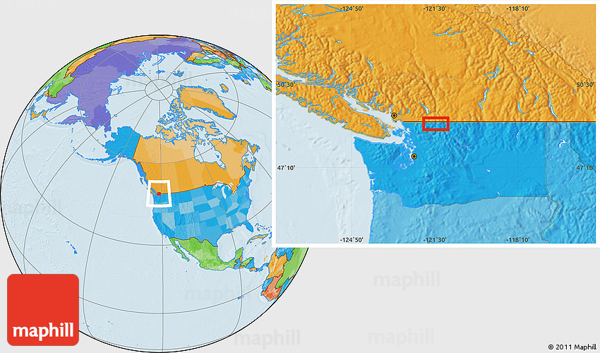 Maphill is a collection of map images. This image combines a political map with the globe centered on the area around 48° 54' 57" N, 121° 28' 29" W. Use the buttons under the image to switch to different map types.