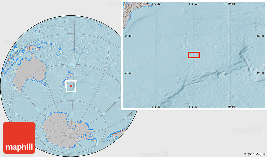 Maphill is a collection of map images. This image combines a gray map with the globe centered on the area around 48° 14' 2" S, 176° 52' 30" E. Use the buttons under the image to switch to different map types.