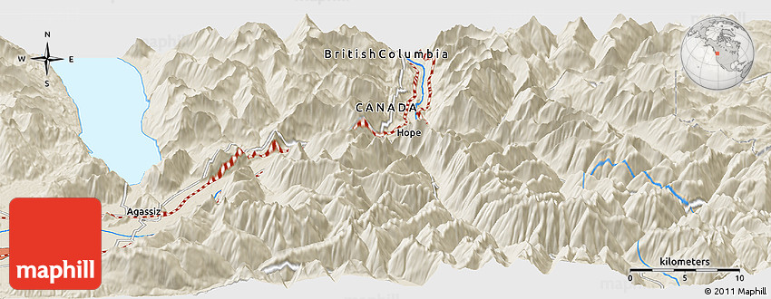 The panoramic shaded relief map represents one of several map types and styles available. Look at the area around 49° 19' 21" N, 121° 28' 29" W from different perspectives.