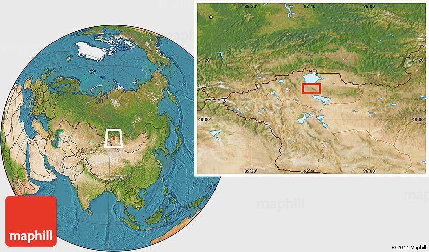 Maphill is a collection of map images. This image combines a satellite map with the globe centered on the area around 49° 43' 37" N, 92° 43' 29" E. Use the buttons under the image to switch to different map types.