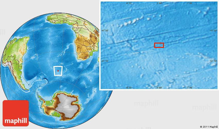 Maphill is a collection of map images. This image combines a physical map with the globe centered on the area around 49° 27' 26" S, 5° 1' 30" W. Use the buttons under the image to switch to different map types.