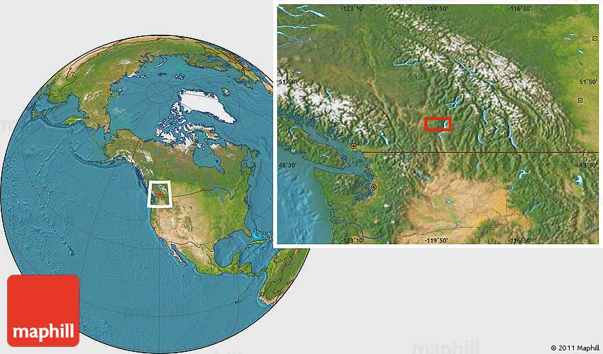 Maphill is a collection of map images. This image combines a satellite map with the globe centered on the area around 50° 7' 47" N, 119° 46' 30" W. Use the buttons under the image to switch to different map types.