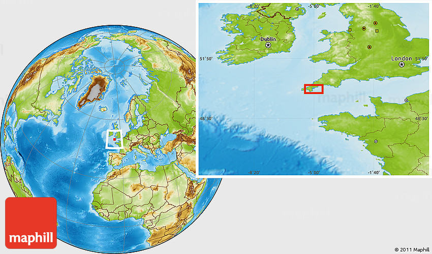 Maphill is a collection of map images. This image combines a physical map with the globe centered on the area around 50° 7' 47" N, 5° 1' 30" W. Use the buttons under the image to switch to different map types.