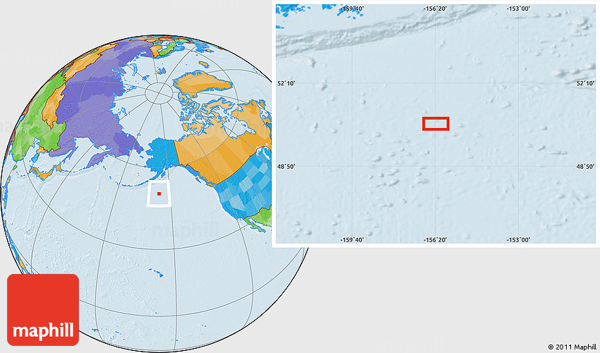 Maphill is a collection of map images. This image combines a political map with the globe centered on the area around 50° 31' 50" N, 156° 19' 29" W. Use the buttons under the image to switch to different map types.