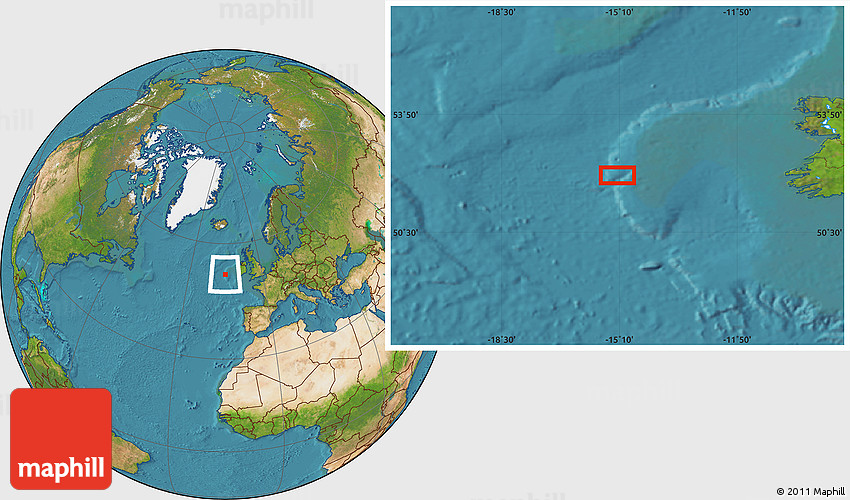 Maphill is a collection of map images. This image combines a satellite map with the globe centered on the area around 52° 6' 54" N, 15° 13' 29" W. Use the buttons under the image to switch to different map types.