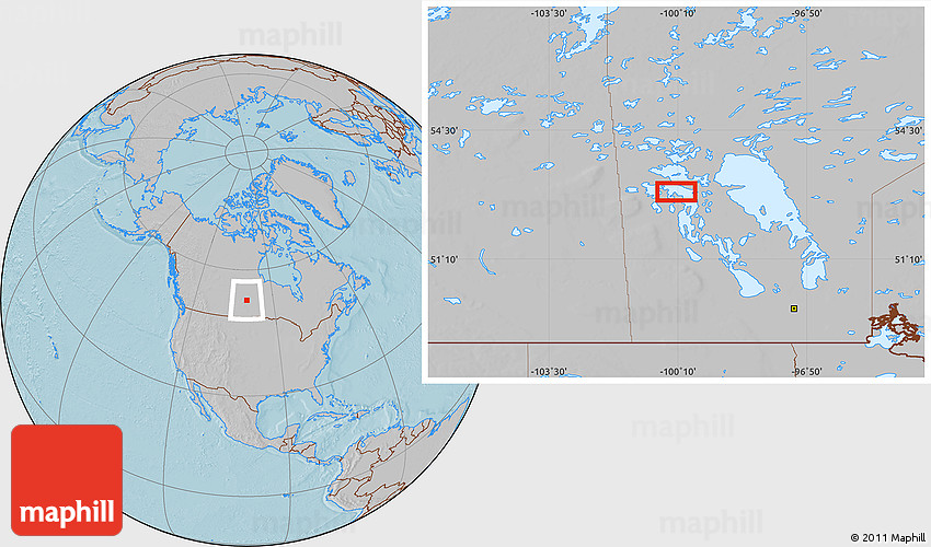 Maphill is a collection of map images. This image combines a gray map with the globe centered on the area around 52° 53' 45" N, 100° 13' 29" W. Use the buttons under the image to switch to different map types.
