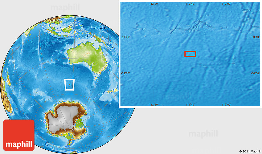 Maphill is a collection of map images. This image combines a physical map with the globe centered on the area around 52° 14' 43" S, 115° 40' 30" E. Use the buttons under the image to switch to different map types.