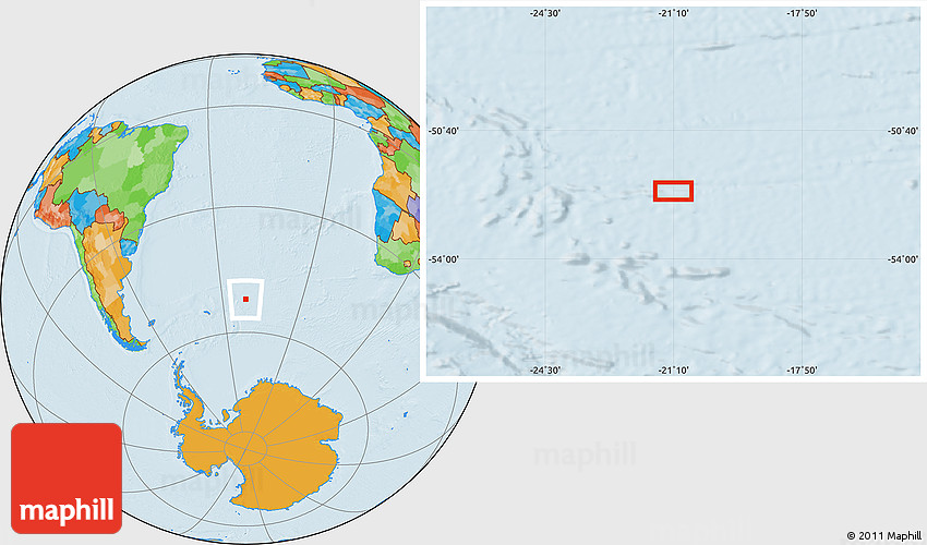 Maphill is a collection of map images. This image combines a political map with the globe centered on the area around 52° 14' 43" S, 21° 10' 29" W. Use the buttons under the image to switch to different map types.