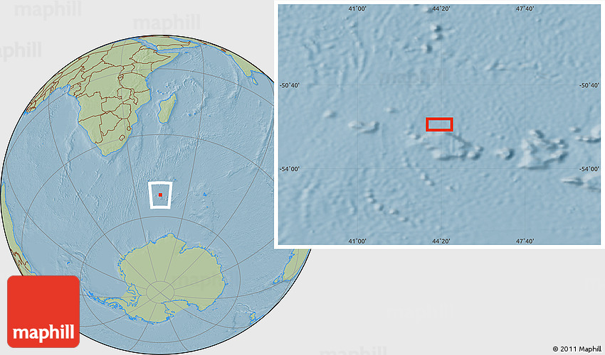 The location map of the area around 52° 14' 43" S, 44° 16' 29" E combines two projections: the orthographic azimuthal projection for the globe and the simple geographic projection for the rectangular part of the map. Geographic projection has straight meridians and parallels, each degree of latitude and longitude is the same size over the entire world map.