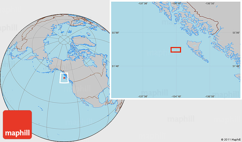 Maphill is a collection of map images. This image combines a gray map with the globe centered on the area around 53° 17' 0" N, 134° 13' 29" W. Use the buttons under the image to switch to different map types.