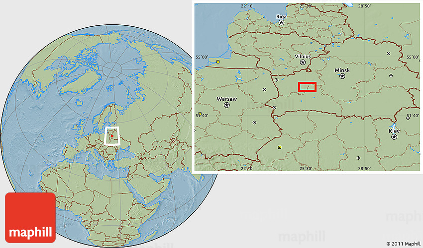 The location map of the area around 53° 17' 0" N, 25° 34' 30" E combines two projections: the orthographic azimuthal projection for the globe and the simple geographic projection for the rectangular part of the map. Geographic projection has straight meridians and parallels, each degree of latitude and longitude is the same size over the entire world map.