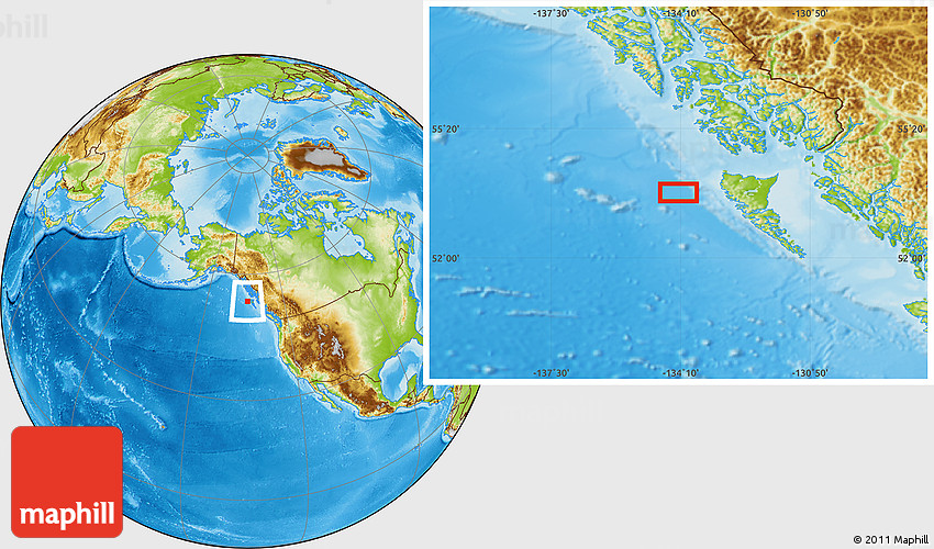 Maphill is a collection of map images. This image combines a physical map with the globe centered on the area around 53° 40' 8" N, 134° 13' 29" W. Use the buttons under the image to switch to different map types.