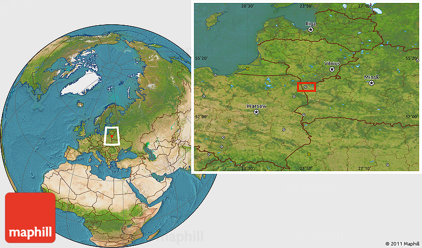 Maphill is a collection of map images. This image combines a satellite map with the globe centered on the area around 53° 40' 8" N, 23° 52' 30" E. Use the buttons under the image to switch to different map types.