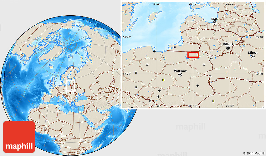 Maphill is a collection of map images. This image combines a shaded relief map with the globe centered on the area around 54° 3' 9" N, 22° 10' 29" E. Use the buttons under the image to switch to different map types.