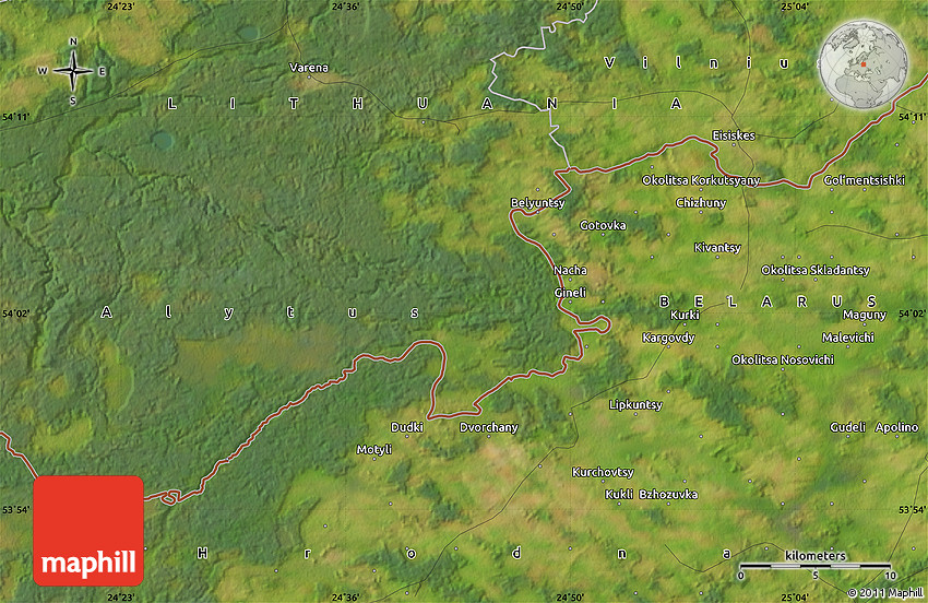 Satellite map shows the Earth's surface as it really looks like. The above map is based on satellite images taken on July 2004. This satellite map of the area around 54° 3' 9" N, 24° 43' 30" E is meant for illustration purposes only. For more detailed maps based on newer satellite and aerial images switch to a detailed map view.