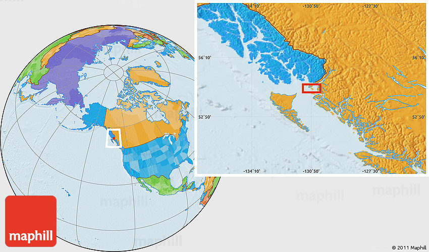 Maphill is a collection of map images. This image combines a political map with the globe centered on the area around 54° 26' 3" N, 130° 49' 29" W. Use the buttons under the image to switch to different map types.