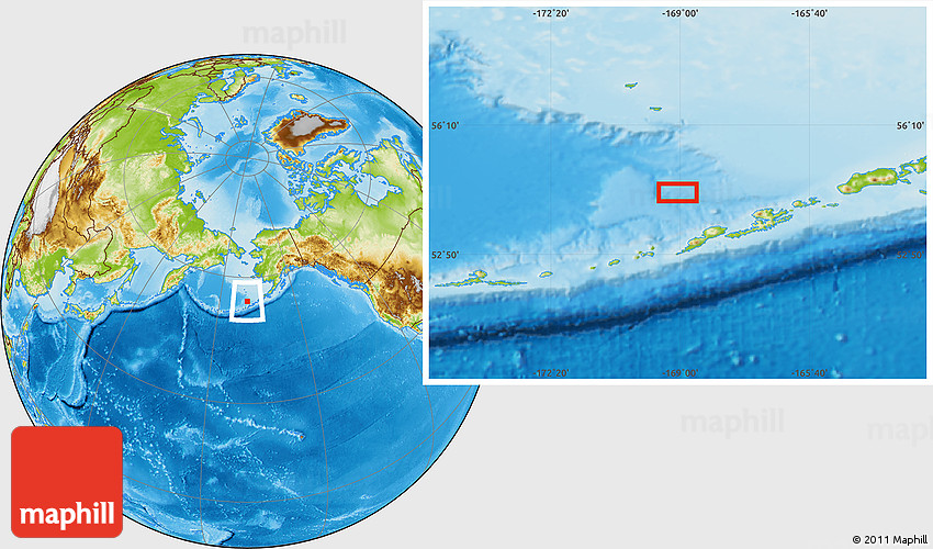 Maphill is a collection of map images. This image combines a physical map with the globe centered on the area around 54° 26' 3" N, 169° 4' 29" W. Use the buttons under the image to switch to different map types.