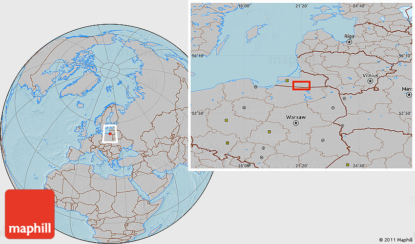 Maphill is a collection of map images. This image combines a gray map with the globe centered on the area around 54° 26' 3" N, 21° 19' 30" E. Use the buttons under the image to switch to different map types.