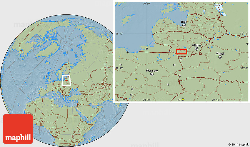 Maphill is a collection of map images. This image combines a savanna style map with the globe centered on the area around 54° 26' 3" N, 23° 52' 30" E. Use the buttons under the image to switch to different map types.