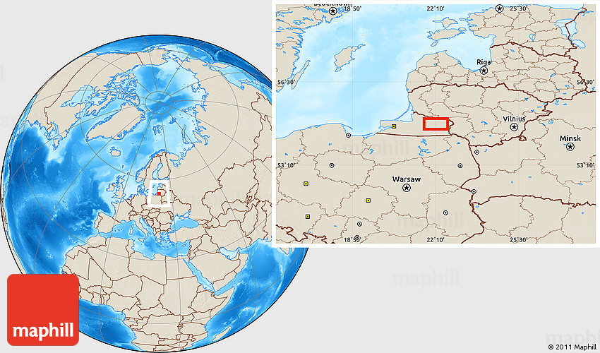 Maphill is a collection of map images. This image combines a shaded relief map with the globe centered on the area around 54° 48' 50" N, 22° 10' 29" E. Use the buttons under the image to switch to different map types.