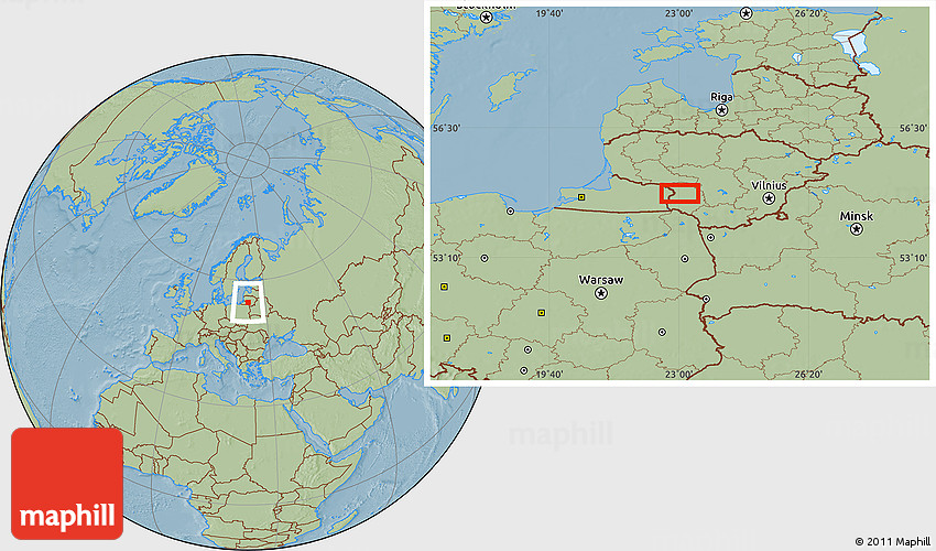 Maphill is a collection of map images. This image combines a savanna style map with the globe centered on the area around 54° 48' 50" N, 23° 1' 29" E. Use the buttons under the image to switch to different map types.