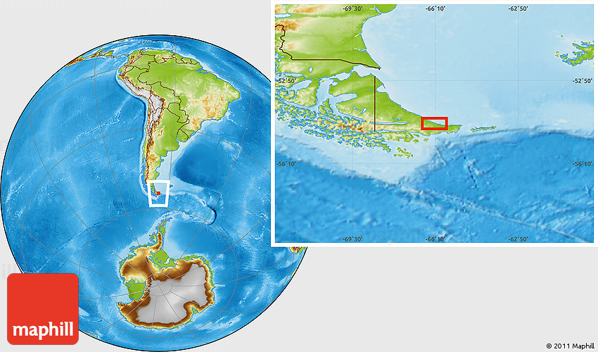 Maphill is a collection of map images. This image combines a physical map with the globe centered on the area around 54° 33' 39" S, 66° 13' 29" W. Use the buttons under the image to switch to different map types.