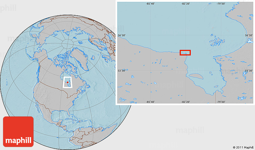 Maphill is a collection of map images. This image combines a gray map with the globe centered on the area around 55° 11' 31" N, 82° 22' 30" W. Use the buttons under the image to switch to different map types.