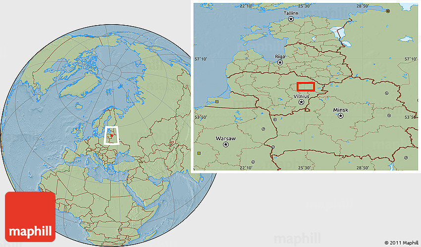 Maphill is a collection of map images. This image combines a savanna style map with the globe centered on the area around 55° 34' 4" N, 25° 34' 30" E. Use the buttons under the image to switch to different map types.