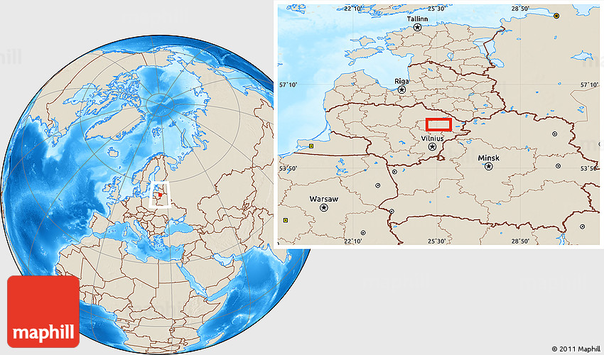 Maphill is a collection of map images. This image combines a shaded relief map with the globe centered on the area around 55° 34' 4" N, 25° 34' 30" E. Use the buttons under the image to switch to different map types.