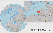 The gray location map represents one of several map types and styles available. Look at the area around 55° 56' 31" N, 20° 28' 30" E from different perspectives.