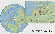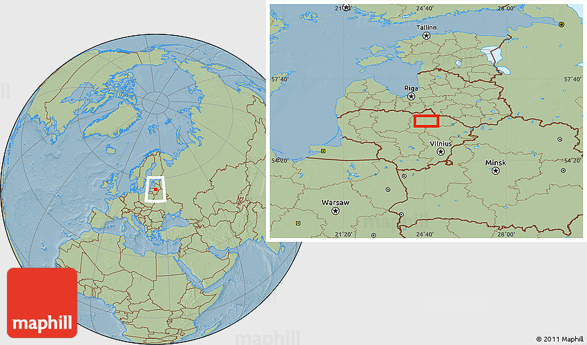 The location map of the area around 55° 56' 31" N, 24° 43' 30" E combines two projections: the orthographic azimuthal projection for the globe and the simple geographic projection for the rectangular part of the map. Geographic projection has straight meridians and parallels, each degree of latitude and longitude is the same size over the entire world map.