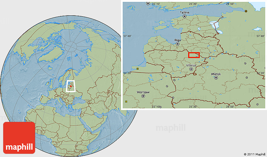 The location map of the area around 55° 56' 31" N, 25° 34' 30" E combines two projections: the orthographic azimuthal projection for the globe and the simple geographic projection for the rectangular part of the map. Geographic projection has straight meridians and parallels, each degree of latitude and longitude is the same size over the entire world map.