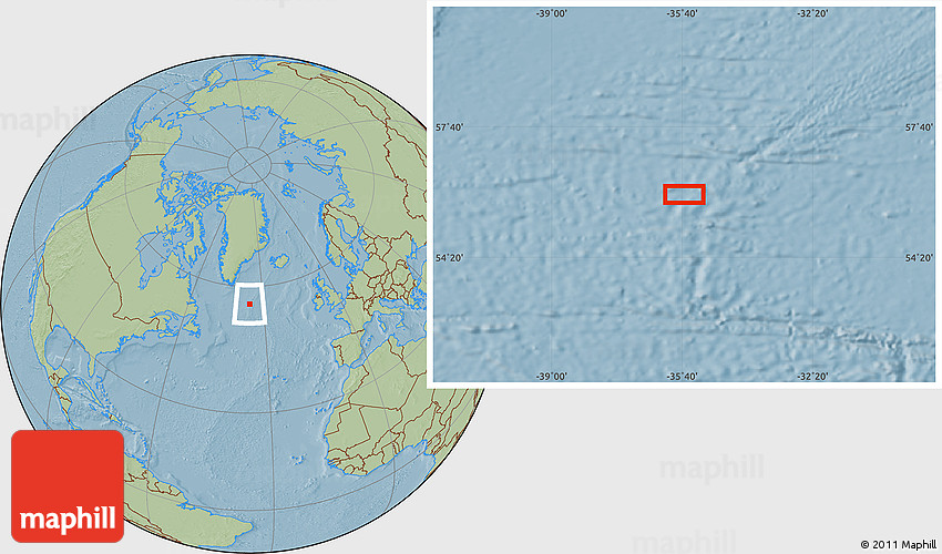 The location map of the area around 55° 56' 31" N, 35° 37' 30" W combines two projections: the orthographic azimuthal projection for the globe and the simple geographic projection for the rectangular part of the map. Geographic projection has straight meridians and parallels, each degree of latitude and longitude is the same size over the entire world map.