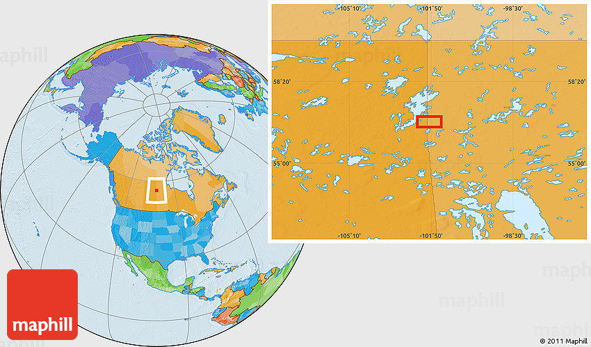 Maphill is a collection of map images. This image combines a political map with the globe centered on the area around 56° 41' 3" N, 101° 55' 30" W. Use the buttons under the image to switch to different map types.