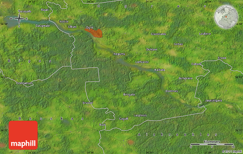 Satellite map shows the Earth's surface as it really looks like. The above map is based on satellite images taken on July 2004. This satellite map of the area around 56° 41' 3" N, 24° 43' 30" E is meant for illustration purposes only. For more detailed maps based on newer satellite and aerial images switch to a detailed map view.