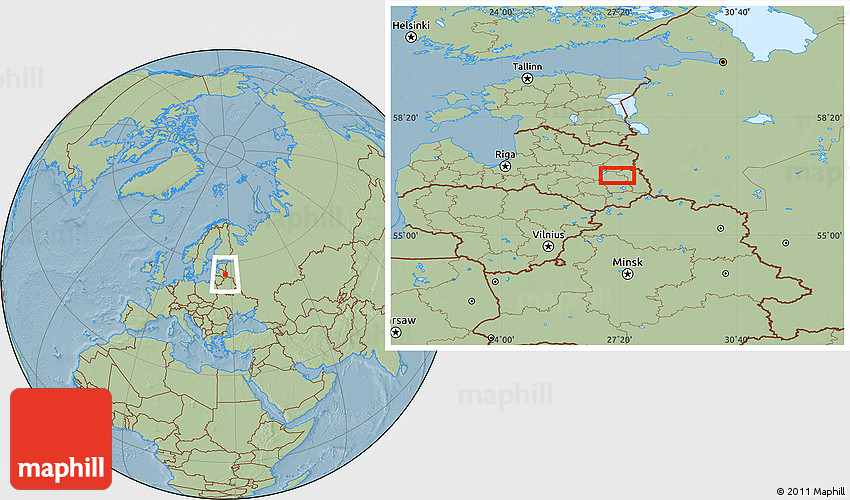 The location map of the area around 56° 41' 3" N, 27° 16' 29" E combines two projections: the orthographic azimuthal projection for the globe and the simple geographic projection for the rectangular part of the map. Geographic projection has straight meridians and parallels, each degree of latitude and longitude is the same size over the entire world map.