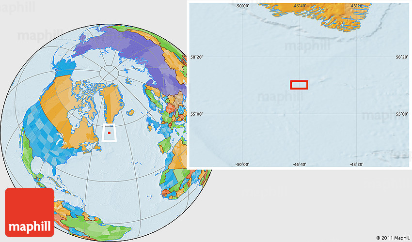 Maphill is a collection of map images. This image combines a political map with the globe centered on the area around 56° 41' 3" N, 46° 40' 29" W. Use the buttons under the image to switch to different map types.