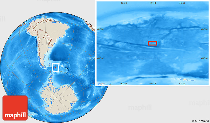 Maphill is a collection of map images. This image combines a shaded relief map with the globe centered on the area around 56° 26' 14" S, 49° 13' 30" W. Use the buttons under the image to switch to different map types.