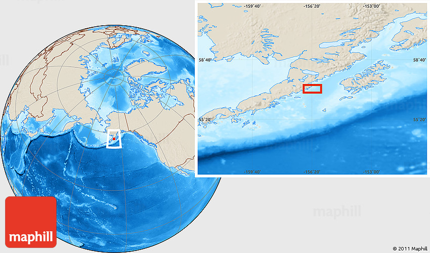 Maphill is a collection of map images. This image combines a shaded relief map with the globe centered on the area around 57° 3' 8" N, 156° 19' 29" W. Use the buttons under the image to switch to different map types.