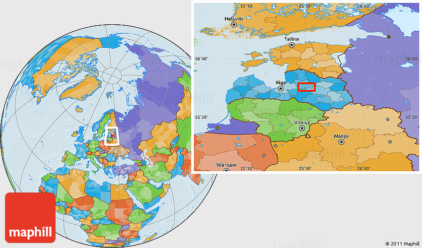 Maphill is a collection of map images. This image combines a political map with the globe centered on the area around 57° 3' 8" N, 25° 34' 30" E. Use the buttons under the image to switch to different map types.