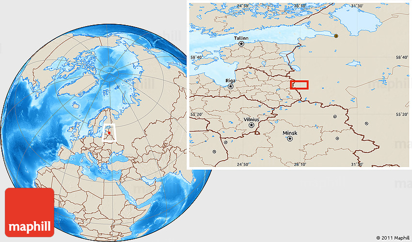Maphill is a collection of map images. This image combines a shaded relief map with the globe centered on the area around 57° 3' 8" N, 28° 7' 30" E. Use the buttons under the image to switch to different map types.
