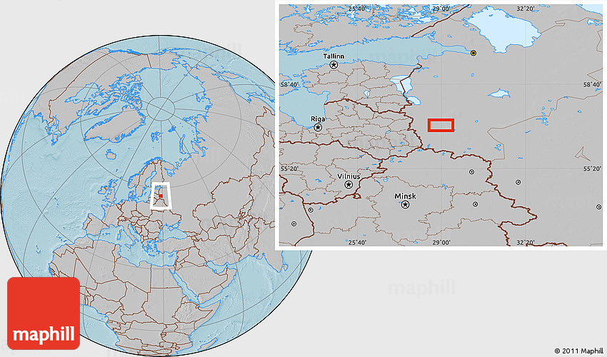 Maphill is a collection of map images. This image combines a gray map with the globe centered on the area around 57° 3' 8" N, 28° 58' 30" E. Use the buttons under the image to switch to different map types.